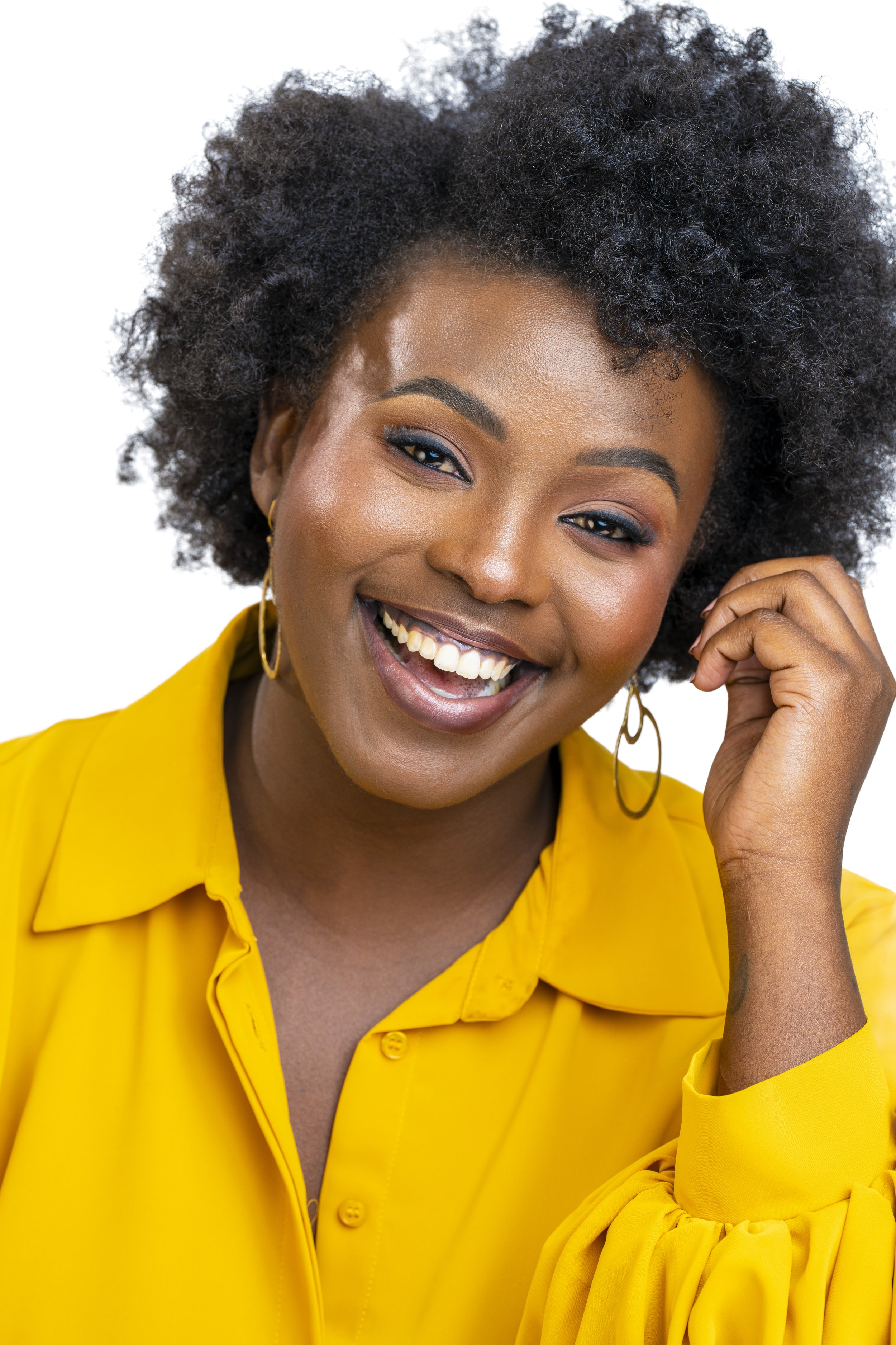 Woman posing with a fur-trimmed coat, colorful makeup, and bracelets, against a yellow background.