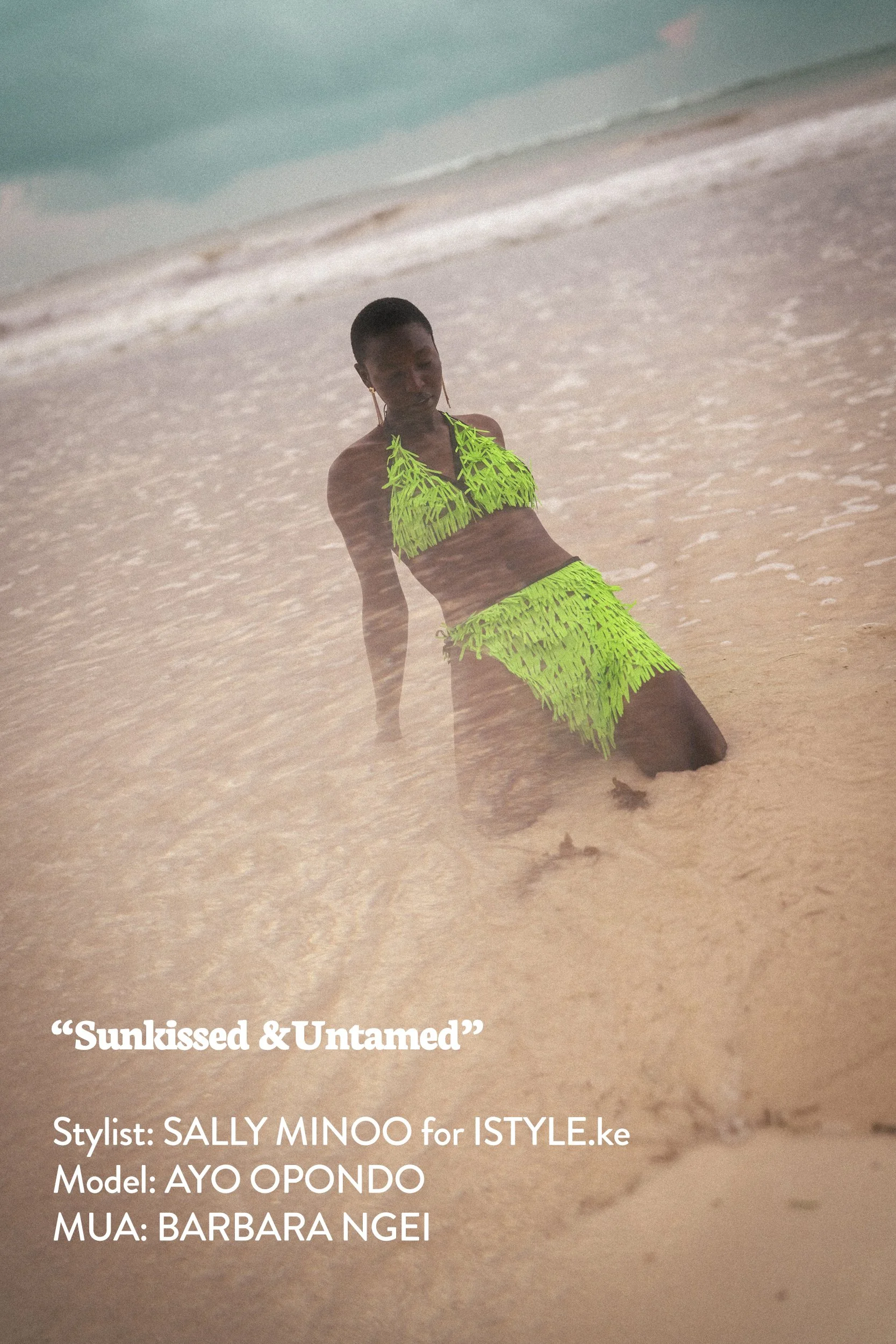 Fashion model sitting in colorful clothing against yellow background, with a red flower in her hair, next to a wicker basket with palm leaves.