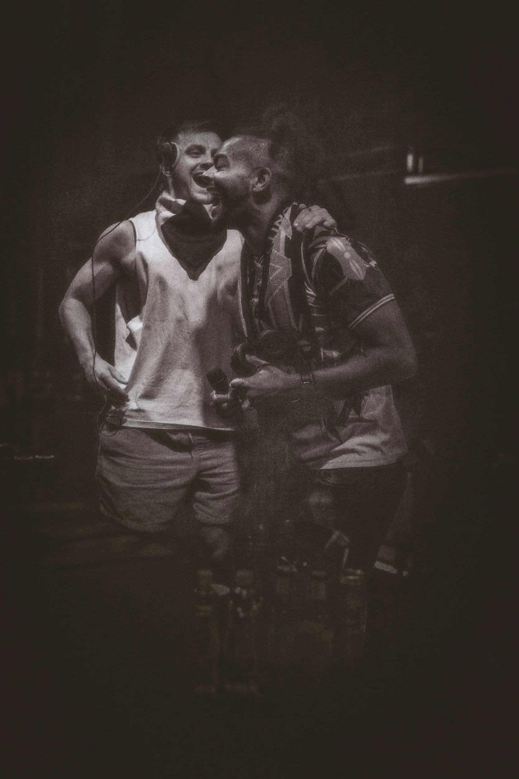 Two performers at a DJ setup with a laptop and sound equipment, one wearing headphones, the other with a microphone, in a dimly lit venue with colorful lighting. View fullsize